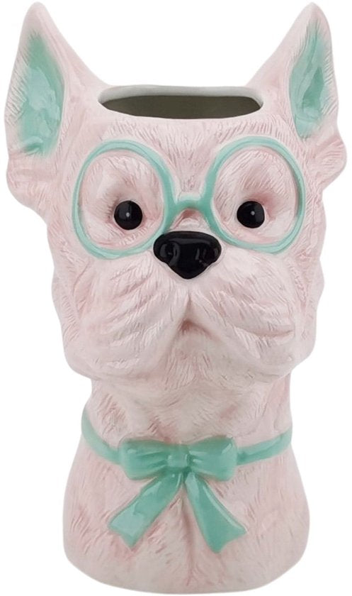 Housevitamin vaas in de vorm van een hond, gemaakt van duurzaam dolomiet, met een roze en mintgroene afwerking.