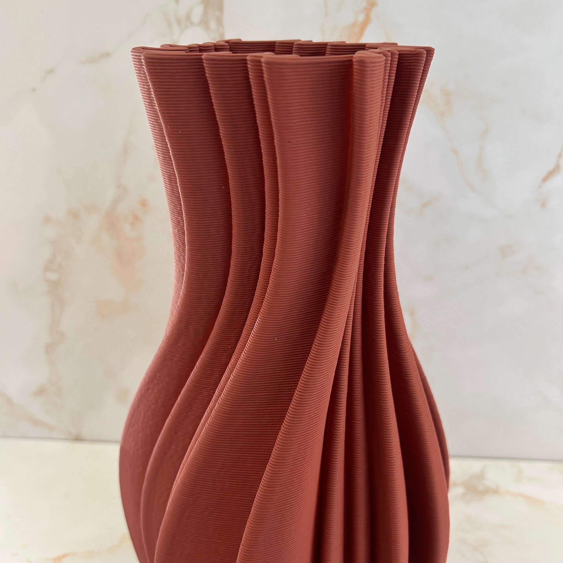 Deze moderne design vaas in terracotta kleur is een stijlvol decoratief object met een sculpturale uitstraling. De vaas heeft een organische, golvende vorm met een verfijnde ribbelstructuur die zorgt voor diepte en beweging. De warme aardetint geeft direct sfeer en past perfect in een modern, minimalistisch of bohemian interieur. Gemaakt met 3d printer.